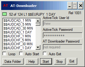 | Color Code Box: The small colored box at the top left will tell you the status of data requests. Each color has a meaning as explained below. In the example image above the box is green. White or Gray: System is stopped or paused by the user and no data requests are being sent. Yellow: A request has been sent for a few current bars for a symbol and time per bar combination. As am example, there might be a request for 50 IBM 5 Minute Bars. All data returned is stored locally so an update requires very few bars. When the update request has been sent the box will be yellow until the data has been received. Blue: The box will be blue when more than a quick update is required. The blue means that the data file must be built from scratch. This requires about 1000 records. Green: The box will turn green when the data has been returned successfully and is being written to you local data files. Text to left of the color code box: This text will show you the current data set being requested. The example above is requesting daily bars for the Forex symbol $$EURJPY. The "52 of 124" means that it is on symbol/timeframe combination 52 of a total of 124 in the list as shown in the Listbox. When all of the data in the list has been returned you have the option to automatically loop to the top and start over so that you can keep you data current during a trading session. The "L1" in the text refers to the lopp number. In the example you are in the first data request loop. Rel 1001: This is the current release number of the AT-Downloader Program. For users of the Ramp Program the AT-Downloader will always be up to date. You do not need to worry about a newer release. Symbol List: The symbol list comes from your requested symbol/timeframe combinations in the Ramp Program. When you change the timeframes and symbols in Ramp the Ramp program will automatically close the AT-Downloader and reopen it with the newly requested symbol list. Note that the AT-Downloader uses the downloaded 5 minute bars to generate local 10 minute and 15 minute bars. The program uses the downloaded 30 minute bars to generate 60 minute, 120 minute and 240 minute bars. The program also uses the downloaded daily bars to generate weekly bars. ActiveTick User Id: This is your user name for your ActiveTick account. ActiveTick Password: This is your password for your ActiveTick account. AT-Downloader Password: For Ramp Users this is not required. The AT-Downloader is stand alone and can be run without Ramp. In that case you will need to email webmaster@nebadawn.com . Loop Checkbox: When you check Loop the downloader will run in a contiuous mode. As soon as the list of symbol/timeframes is complete it will pause 10 seconds and start at the top again. Auto Start Checkbox: When you check Auto Start the data will start downloading as soon as you start the AT-Downloader program. Typically you would leave this checked. Auto Exit Checkbox: If you check on Auto Exit the AT-Downloader will close as soon as data for all symbol/timeframes in the list have been updated. Data Folder Button: Clicking on this button will bring up Windows Explorer in your data fold named \AT-Data\. The data is stored in very simple .csv (comma separated value) files that can be opened with any spreadsheet or simple text editor. Each record or line of data in the files is for one bar in the format "date, time, open, high, low, close, volume". A sample for CSCO 5 minute bars is below. ![]() Help Button: The Help button will take you to this web page. Start Button: If you have not checked the Auto Start Checkbox this button will start the data downloading. Stop Button: This will stop the downloading process without exiting the program. Exit Button: The Exit button will stop the downloading and exit the program. |