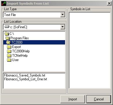 In TC2000, simply create a watch list to put them in such as one labeled “From Fibonacci Market Scanner”. In TC2000, go to this watch list and remove any existing symbols using the pull down menu “Watch List - Remove Symbols - All”. Then use the pull down menu, “Watch List - Import Symbols from List”. The TC2000 window shown below will appear.