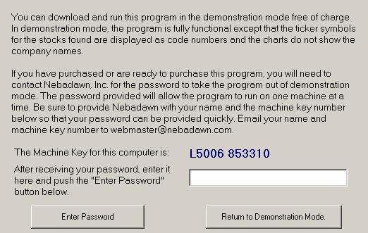Instructions for entering a password and getting The Fibonacci Market Scanner out of Demonstration mode are located on the password screen shown in figure #1 below: