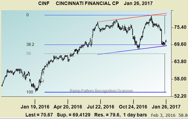 Each control is explained below Number of bars to look back to find the maximum high and lowest low. The Fibonacci scanner will look back this many bars to find the highest high and lowest low. The default is 2500 bars. You can make this smaller if you like but you may miss some important multi year levels. Don't be concerned because Ramp will automatically look at smaller patterns if no larger ones are found. Leave this at the default 2500 unless you really want to see only smaller patterns. % from line to be considered a touch You can adjust how close the price must be to a Fibonacci line to be considered a touch. This percent is based on %100 being a total move retracement. The default value is 1%. You can change this value if you want to make the scan more or less rigorous. If in doubt, just use the 1% default value. Search this many bars back to find the pattern. You can have the scanner look back several bars for a confirmed retracement. An example here might be if you have been gone for two days. You can enter a 3 and the scanner will test the last three days. The default value of 1 only considers the current bar. Use last week for max high and lowest low values check box. This check box uses only last weeks data to find the highest high and lowest low. When this box is checked the number of bars to look back is replaced with last weeks. Ignore the scan rules below and show all charts check box. This will ignore the selected scan rules and show you all charts. Scan Rules This will allow you to select up to 8 Fibonacci retracement levels for a single scan. If any rule is triggered a chart will pop up. In the example above 8 rules have been set up and the top 4 have been selected to be used. Show auto support and resistance levels check box. When this is checked automatic support and resistance lines are overlaid on all of the charts. Fibonacci Retracement Scanner Sample Images: |